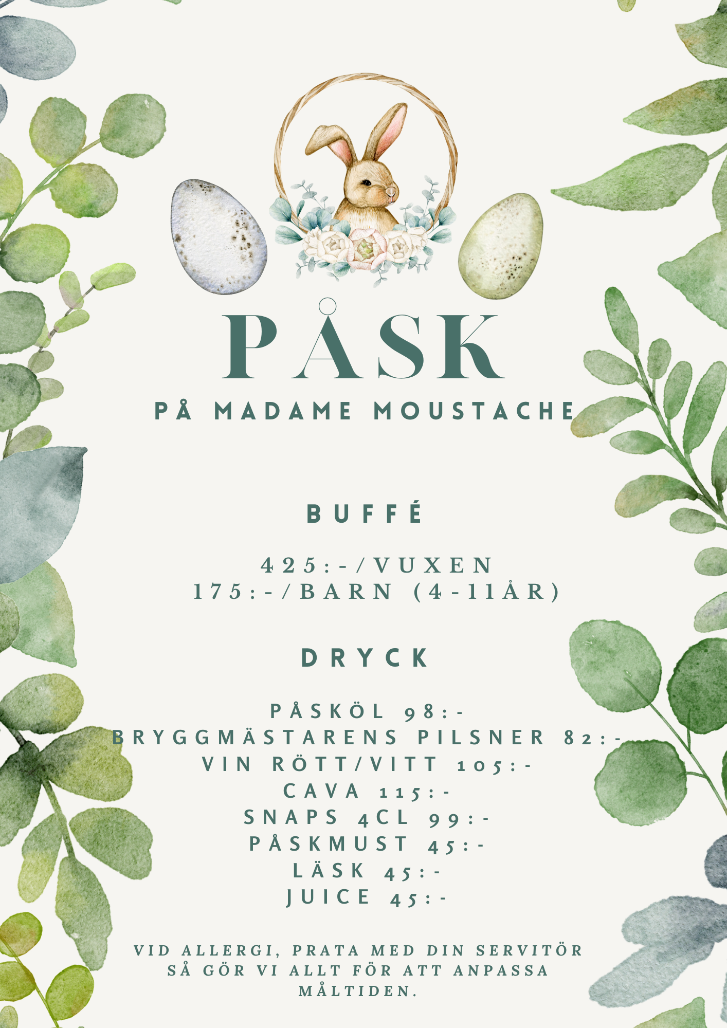 Enligt traditionen på Madame så dukar vi upp till påskbuffé, med allt du kan tänka dig och lite till. Så glöm inte att boka bord till dig och dina nära.
