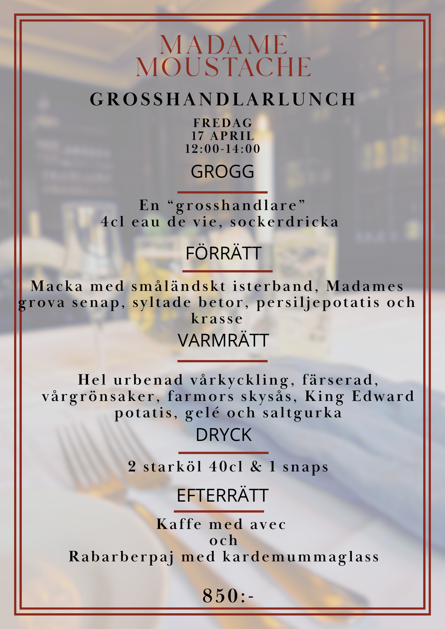 Madame bjuder in till både påskbuffé och grosshandlarlunch i april.